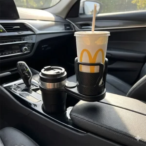 Este adaptador se instala en el portavasos estándar del vehículo y duplica la capacidad de almacenamiento mediante un diseño de eje rotativo. El soporte superior cuenta con un sistema de garras extensibles que permite sujetar desde botellas convencionales hasta recipientes más anchos, como bowls de comida rápida o termos grandes, mientras que la base mantiene disponible el espacio original.